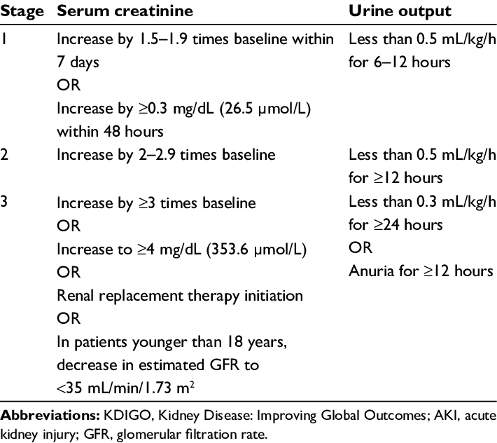 - AKI is stratified into 5 stages, based on severity and duration of renal injury: Risk, Injury, Failure, Loss, and End-stage disease (see Table below).
