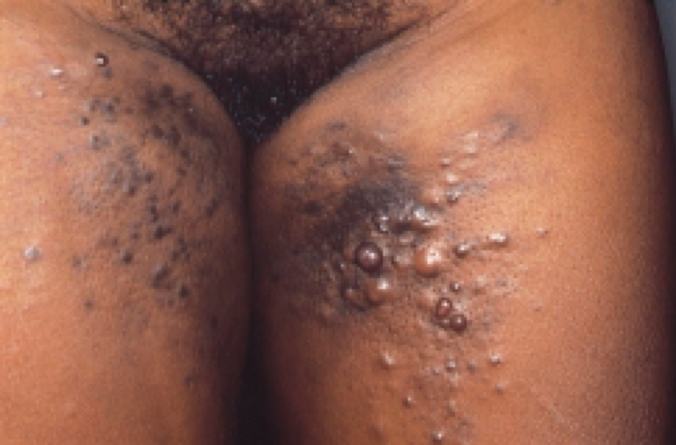 - Presents clinically as inflammatory nodules, discharging ulcers, sinuses, and fistulae