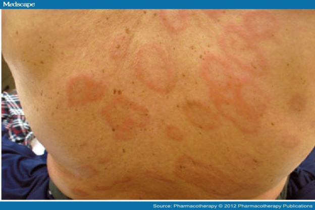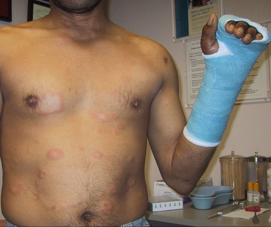 The individual lesions tend to be more raised in the center than around the edges. Nerve involvement occurs early, even before the skin lesions, with enlargement and tenderness of the nerves.