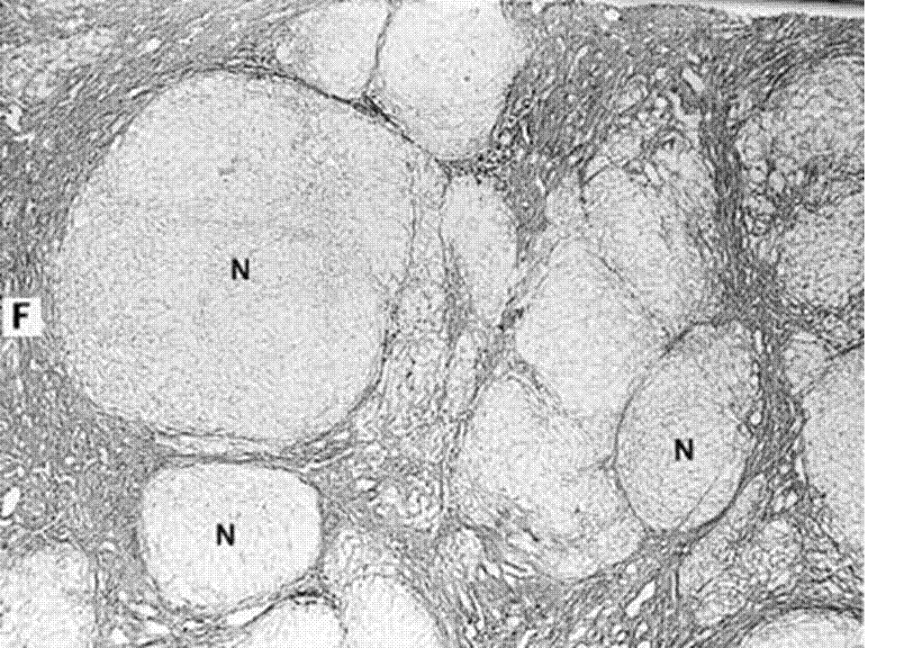 Defined as diffuse scarring/fibrosis of liver characterized by hepatic necrosis, formation of regenerative nodules, and loss of lobular and vascular architecture of the liver.