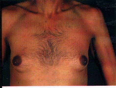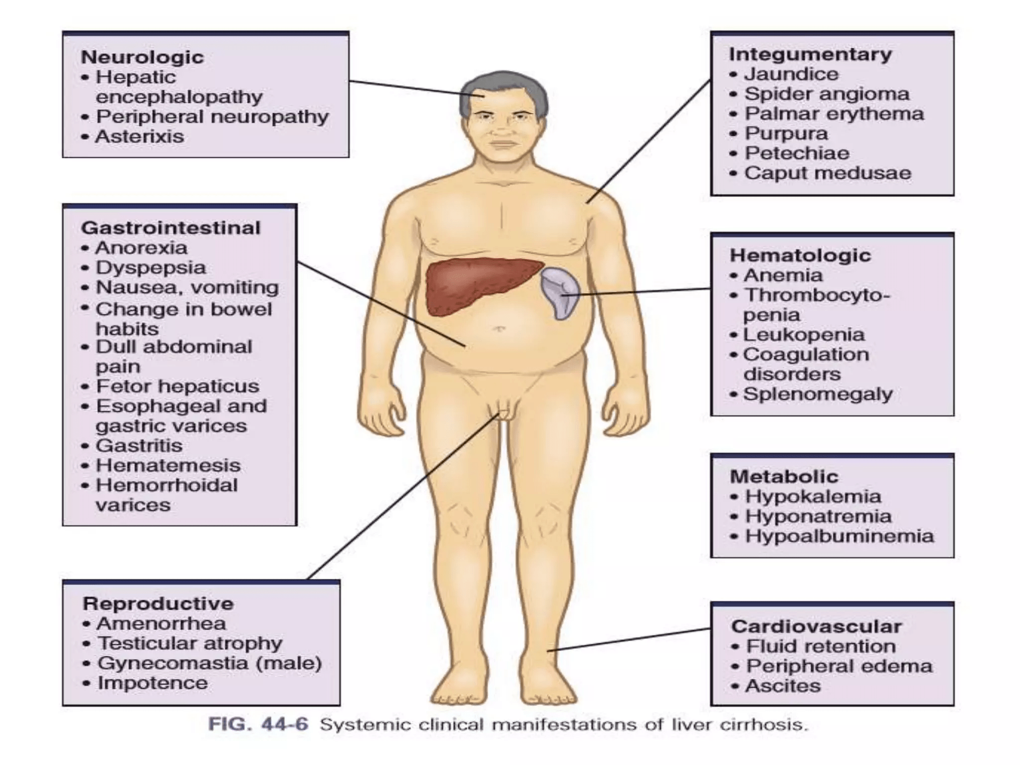 - Inability of the cirrhotic liver to metabolize biomolecules lead to accumulation of metabolites giving rise to features like gynaecomastia (oestrogen) and other feminization features (loss of axillary and pubic hair).