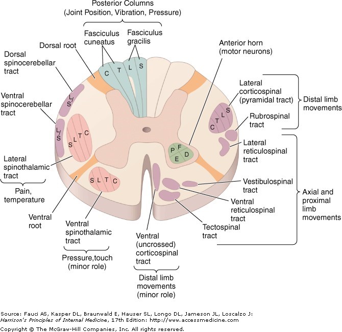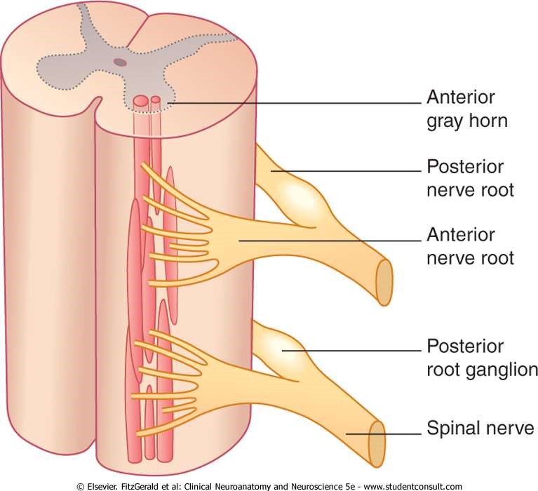 - Consists of 31 segments each consisting of an exiting ventral motor root and an entering dorsal sensory root.