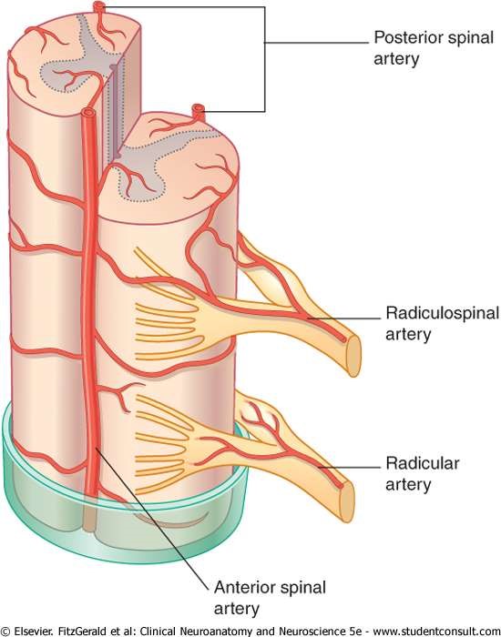 It derives its blood supply at segmental levels from a single anterior and 2 posterior spinal arteries.