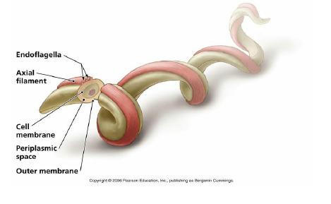 Spirochaetes are distinguished from other bacterial phyla by the location of their flagella, sometimes called axial filaments, which run lengthwise between the bacterial inner membrane and outer membrane in periplasmic space. These cause a twisting motion which allows the spirochaete to move about.