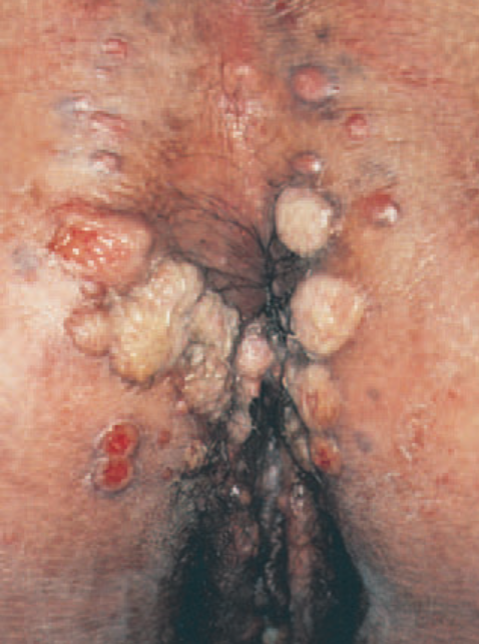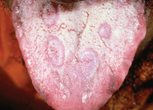 In warm, moist, intertriginous body areas, including the perianal area, vulva, scrotum, inner thighs, axillae, and skin under pendulous breasts, papules can enlarge and become eroded to produce broad, moist, pink or gray-white, highly infectious lesions called condylomatalata; these lesions develop in 10% of patients with secondary syphilis. Superficial mucosal erosions, called mucous patches, occur in 10 to 15% of patients and may involve the lips, oral mucosa, tongue.
