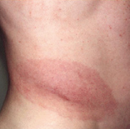 Initial lesions are bilaterally symmetric, pale red or pink, non-pruritic, discrete, round macules that measure 5 to 10 mm in diameter and are distributed on the trunk and proximal extremities.