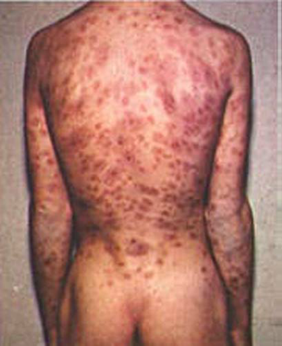 After several days or weeks, red papular lesions 3 to 10 mm in diameter also appear.