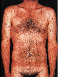 Localized or diffuse symmetric mucocutaneous lesions and generalized non-tender lymphadenopathy.