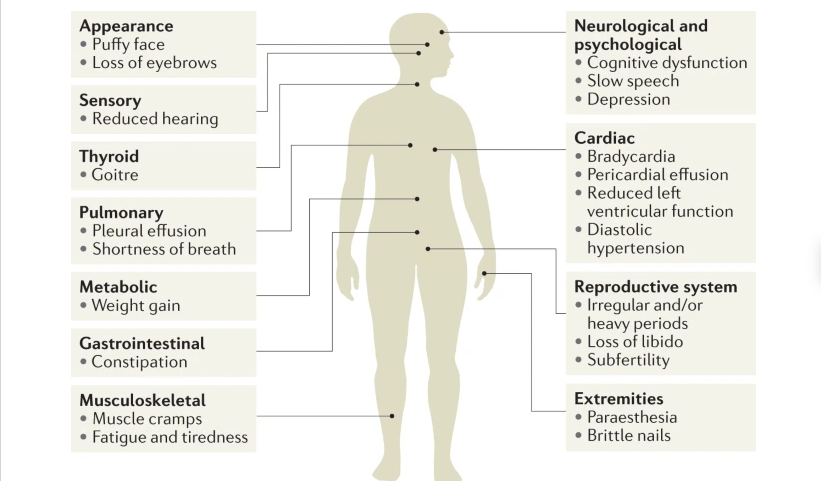 - Weight gain - decreased metabolic rate + accumulation of fluid (nonpitting edema) that is rich in glycosaminoglycans