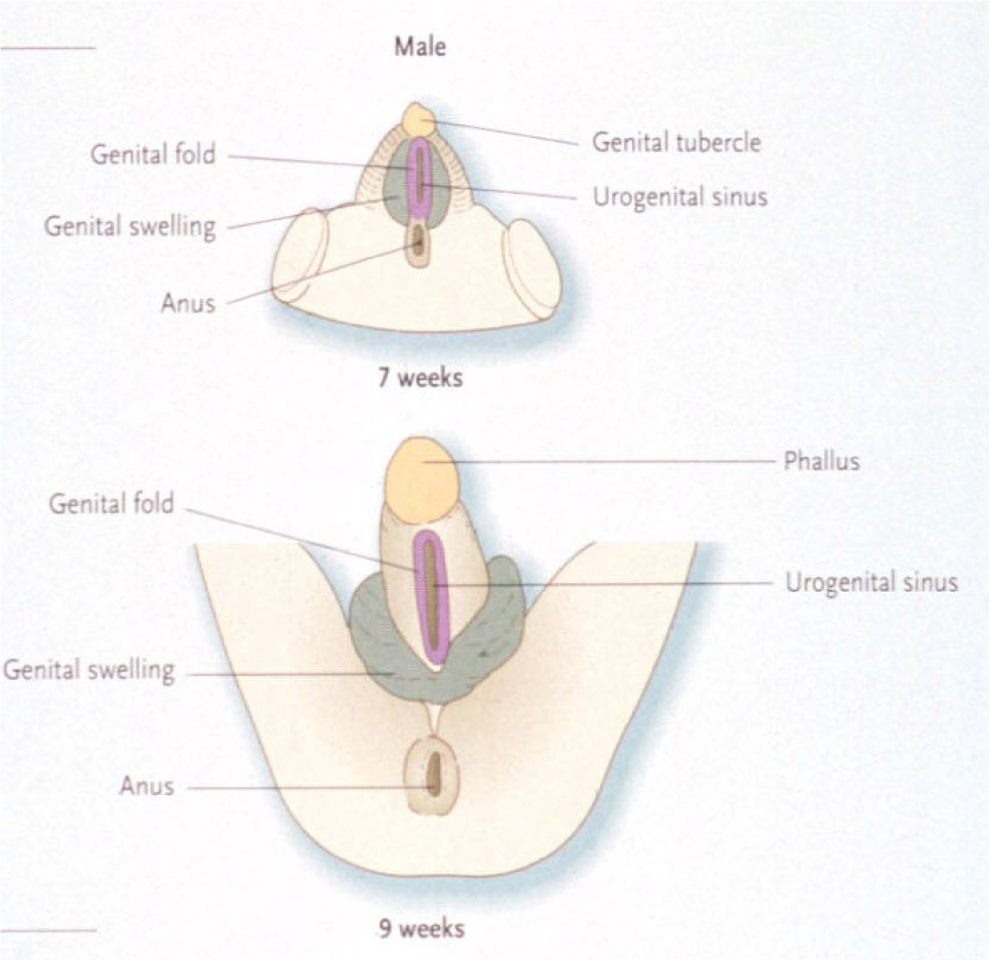 - Differentiation of external genitalia into male pattern starts at 8 weeks.